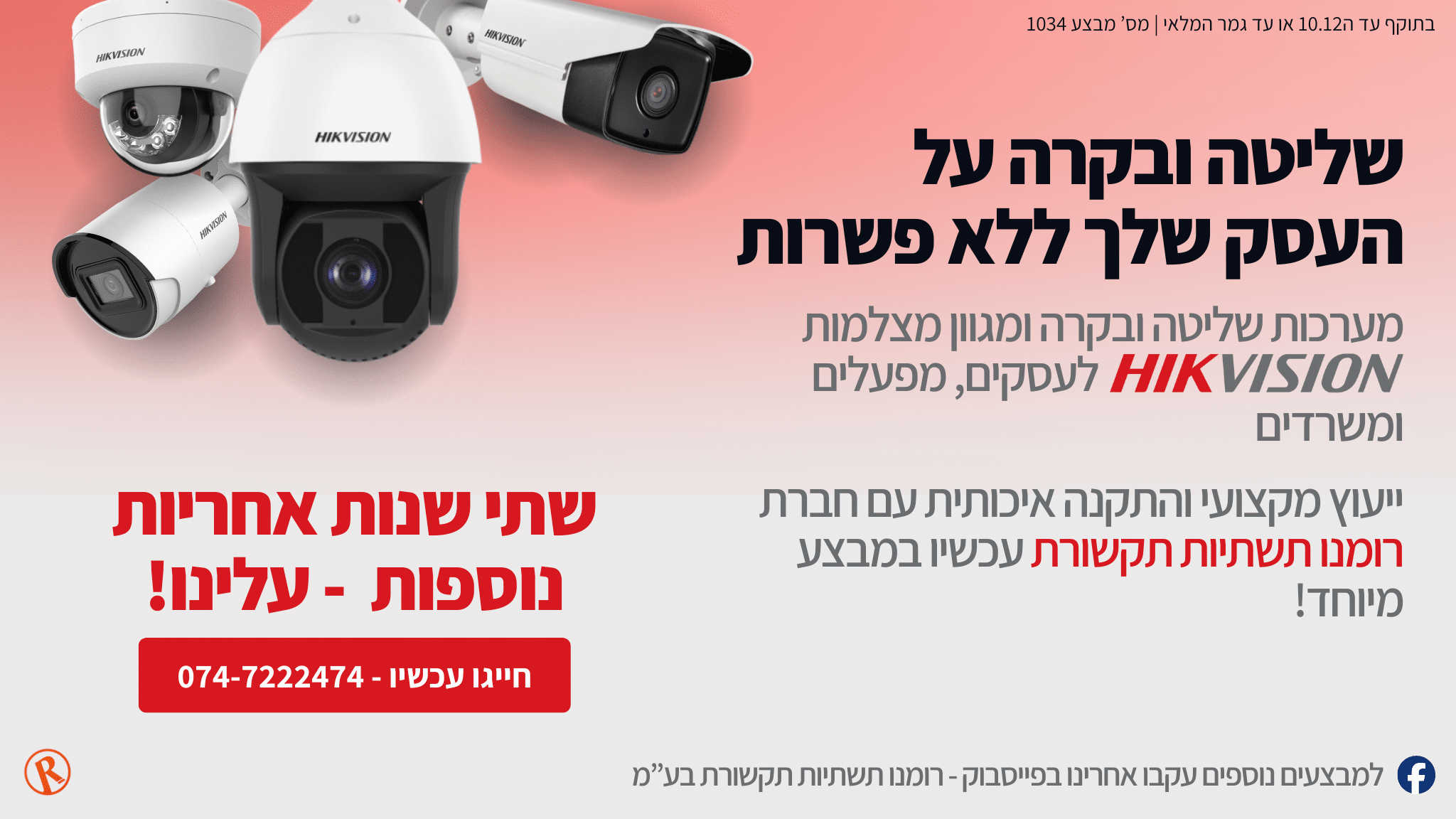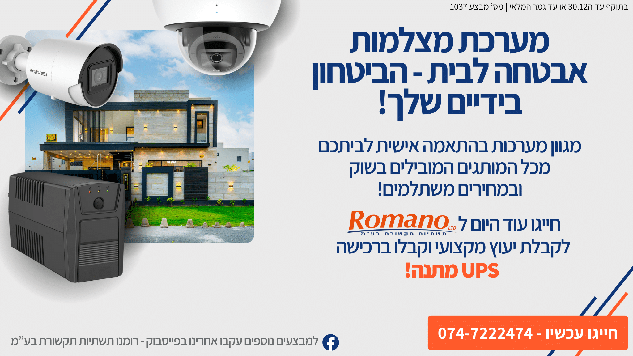 עם מערכות מצלמות אבטחה מתקדמות מבית רומנו תשתיות תקשורת, אתם שולטים על הביטחון שלכם בכל רגע ובכל מקום.